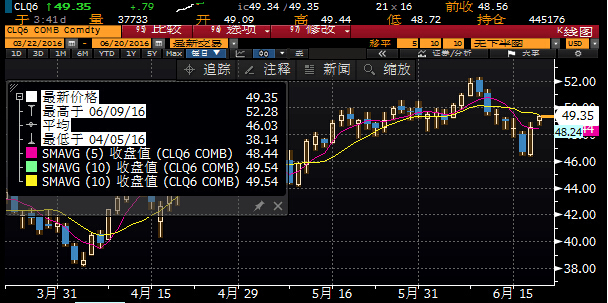 周一(6月20日)亞歐時(shí)段國際油價(jià)震蕩上漲,美原油8月期貨一度刷新四日高點(diǎn)至49.44美元/桶,布倫特原油8月期貨一度上探50美元關(guān)口,美元走軟且市場對(duì)于英國可能退出歐盟的疑慮緩解,蓋過了美國原油鉆井?dāng)?shù)的增加的影響,幫助支撐油價(jià)。