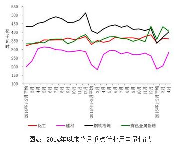4月份,四大高載能行業用電量合計1454億千瓦時,同比下降0.5%,增速比上年同期提高2.5個百分點,占全社會用電量的比重為31.8%。其中,化工行業用電量362億千瓦時,同比增長5.9%,增速比上年同期提高4.5個百分點;建材行業用電量283億千瓦時,同比增長4.4%,增速比上年同期提高15.5個百分點;黑色金屬行業用電量402億千瓦時,同比下降4.3%,增速比上年同期提高2.8個百分點;有色金屬冶煉行業407億千瓦時,同比下降4.9%,增速比上年同期回落10.0個百分點。