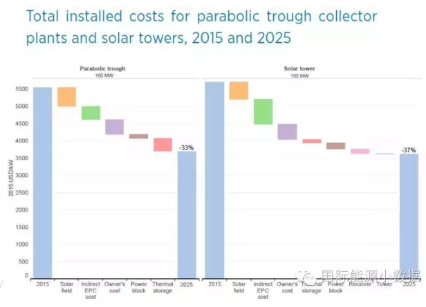 光伏成本持續下降,那么光熱發電成本如何變化呢?以7.5-9小時儲能容量為例,160兆瓦槽式光熱電站裝機成本可望下降33%,從5.5美元/瓦下降到3.6美元/瓦;而150兆瓦塔式光熱電站成本可望下降37%,從大約5.7美元/瓦降至3.6美元/瓦。