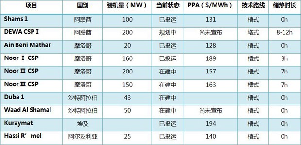 圖:中東及北非(MENA)光熱發電項目統計