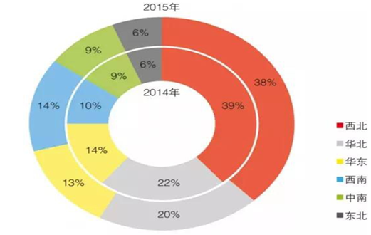 與2014年相比,西南地區同比增長幅度最大為91%,其次為中南地區同比增長為37%,東北地區同比增長35%,西北同比增長27%,華北地區和華東地區同比增長分別為22%和20%。