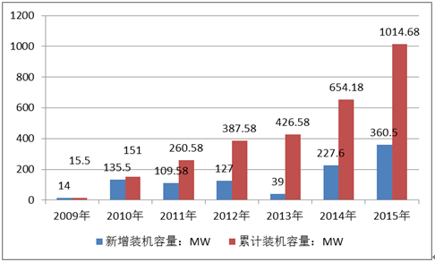 2015年,全國(除臺灣地區外)新增裝機容量30753MW,同比增長32.6%,新增安裝風電機組16740臺,累計裝機容量145362MW,同比增長26.8%,累計安裝風電機組92981臺。