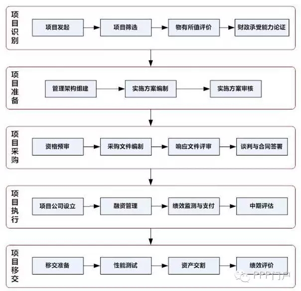 財政部《政府和社會資本合作模式操作指南(試行)》(財金(2014)113號),對PPP項目識別、準備、采購、執行、移交等操作環節進行了規范。這其中尤其需要重視充分做好物有所值評價,通過這種評估方法,判斷采取PPP模式與政府傳統采購模式相比,是否降低項目全生命周期成本。流程圖大致如下: