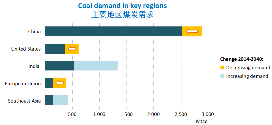 煤炭行業的未來處境可謂“雪上加霜”,主要地區煤炭需求不斷回落。IEA指出,中國的能源轉型是影響全球大勢的關鍵所在,煤炭消費達峰標志著煤炭行業的轉折點。未來煤炭需求將大幅回落,IEA預計2040年中國煤炭需求僅為2500百萬噸標準煤。為了控制空氣污染,減少碳排放,電力和天然氣將填補煤炭需求減少的空間,其中,天然氣的使用量將在21世紀30年代超過煤炭。