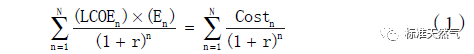公式(1)代表的意義是收入的凈現(xiàn)值等于成本的凈現(xiàn)值,即LCOE的恒等式定義,其中LCOE與En的乘積是系統(tǒng)在生命周期內(nèi)的總收益。將公式(1)進行恒等變形后得出公式(2)。