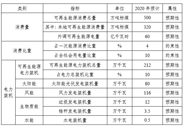 著力擴大可再生能源電力裝機規模,提高消費比重,增強消納能力,提升產業技術水平。到2020年,可再生能源利用量達到500萬噸標煤,占一次能源消費比重超過4%;可再生能源發電裝機達到212萬千瓦,占全市電力總裝機的10%;非水可再生能源消納電量(含外購可再生能源電量)占全社會用電量的比重達到10%。