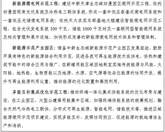 加快推廣分布式清潔能源供能方式,促進能源的就地轉化和消納,提高能源綜合利用效率。推動可再生能源和常規能源智能融合發展,推進可再生能源區域微網建設,將風、光、生物質等各類可再生能源與儲電、熱(冷)及天然氣高效利用技術相結合,建設終端一體化集成供能系統,發揮多能互補和協同供應,實現資源優化配置與高效供給。創新“互聯網+新能源”發展模式,促進智慧城市建設。加快區域示范應用,繼續推進新能源示范產業園區建設,實施中新天津生態城動漫園、天大求實總部基地新能源微網和“風光漁-電熱儲”綜合互補等示范項目。