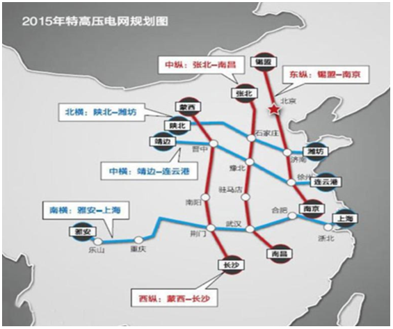 特高壓輸電網(wǎng)具有遠(yuǎn)距離、大容量和低損耗等特點,是西電東送的主要途徑。從特高壓的發(fā)展格局上看,我國“十二五”特高壓規(guī)劃為建設(shè)“三橫三縱一環(huán)網(wǎng)”特高壓骨干網(wǎng)架,把內(nèi)蒙古、陜西、河北的風(fēng)電、煤電通過三條縱向的特高壓通道送往華北、華中和華東;把北部的煤電和西南的水電,通過三條橫向特高壓通道送往華北、華中和長三角地區(qū),形成西電東送、北電南送的資源配臵格局。截止 2015 年,我國完成了兩條示范工程特高壓線路和“三交四直”的建設(shè),西北地區(qū)包括甘肅、內(nèi)蒙古和新疆等省份初顯戰(zhàn)略布局。但是輸電容量遠(yuǎn)不足以完成全部西電東送的要求,十三五期間特高壓建設(shè)進一步加速中。