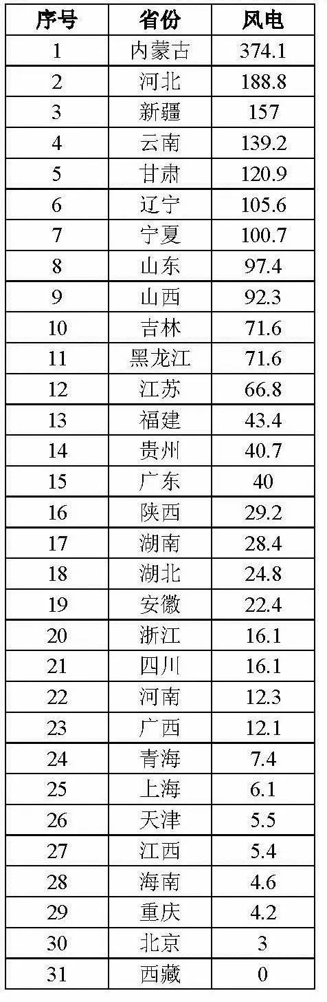 表2:2016年1~11月各省風電發電量(單位:億kWh)