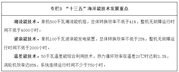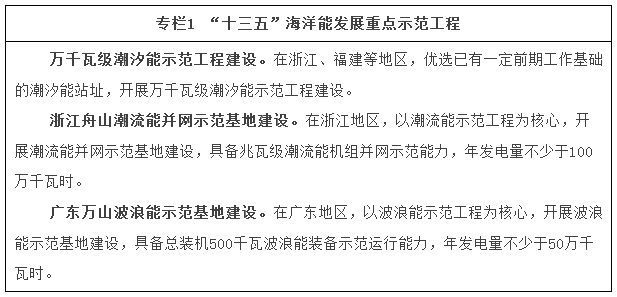 積極開發沿海潮汐能資源。優先支持已有一定工作基礎的優良站址的潮汐能電站建設項目,推動萬千瓦級潮汐能示范電站建設;推動潟湖式、動態潮汐能技術等環境友好型新型潮汐能技術工程示范;開展具備綜合利用前景的潮汐能綜合開發示范工程建設。力爭啟動1~2個萬千瓦級潮汐能示范工程建設,完成1~3個新型潮汐能技術及綜合利用示范工程建設。潮汐能總裝機規模突破30,000千瓦。