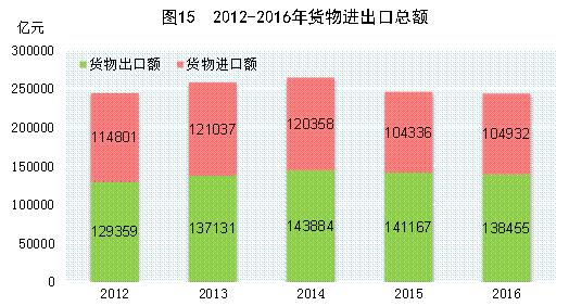 全年貨物進出口總額243386億元,比上年下降0.9%。其中,出口138455億元,下降1.9%;進口104932億元,增長0.6%。貨物進出口差額(出口減進口)33523億元,比上年減少3308億元。對“一帶一路”[28]沿線國家進出口總額62517億元,比上年增長0.5%。其中,出口38319億元,增長0.5%;進口24198億元,增長0.4%。