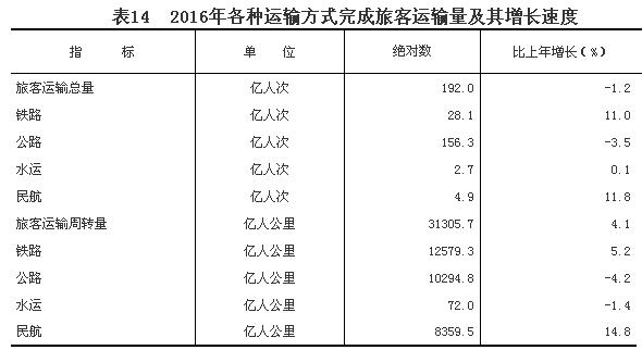 全年旅客運輸總量192億人次,比上年下降1.2%。旅客運輸周轉量31306億人公里,增長4.1%。