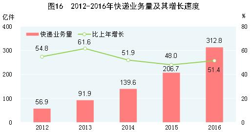 全年完成郵電業務總量[30]43344億元,比上年增長52.7%。其中,郵政行業業務總量7397億元,增長45.7%;電信業務總量35948億元,增長54.2%。郵政業全年完成郵政函件業務36.2億件,包裹業務0.3億件,快遞業務量312.8億件;快遞業務收入3974億元。電信業全年新增移動電話交換機容量[31]7318萬戶,達到218384萬戶。年末全國電話用戶總數152856萬戶,其中移動電話用戶132193萬戶。移動電話普及率上升至96.2部/百人。固定互聯網寬帶接入用戶[32]29721萬戶,比上年增加3774萬戶,其中固定互聯網光纖寬帶接入用戶[33]22766萬戶,比上年增加7941萬戶;移動寬帶用戶[34]94075萬戶,增加23464萬戶。移動互聯網接入流量93.6億G,比上年增長123.7%。互聯網上網人數7.31億人,增加4299萬人,其中手機上網人數[35]6.95億人,增加7550萬人。互聯網普及率達到53.2%,其中農村地區互聯網普及率達到33.1%。軟件和信息技術服務業[36]完成軟件業務收入48511億元,比上年增長14.9%。