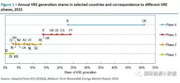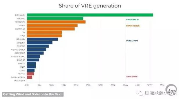 國(guó)際能源署發(fā)布報(bào)告Getting Wind and Sun onto the Grid,按照電網(wǎng)吸納間歇性可再生能源(主要是風(fēng)電、光伏)的比例劃分了4個(gè)階段: