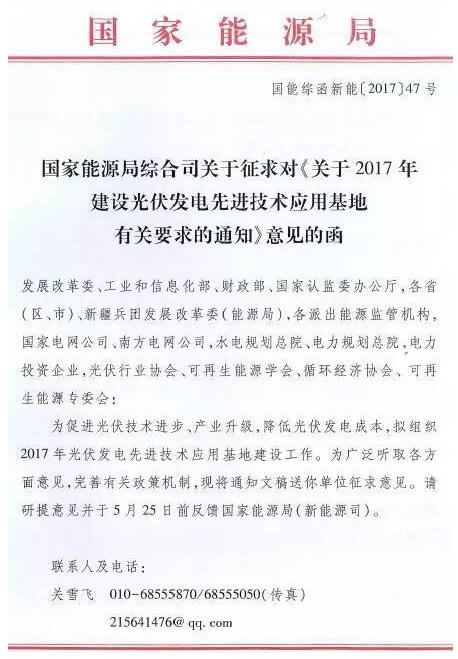 國家能源局綜合司于近日印發《關于2017年建設光伏發電先進技術應用基地有關要求的通知》(征求意見稿),指出2017年光伏發電先進技術應用基地共計建設8-10GW,每個基地本期建設規模不小于500MW,最大1GW。已建成未驗收以及在建基地所在市(縣)級區域不安排新建基地。每個省(區、市)可申報3個基地,總規模不超過2GW。2016年光伏發電未達到最低保障小時數的省(區、市)不得申請。
