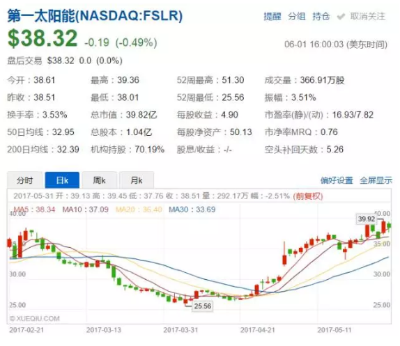 截止至2017年6月1日,第一太陽能(代碼:FSLR)的收盤價為38.32美元,在短短兩個月的時間內(nèi),F(xiàn)SLR股價已經(jīng)從最低點(diǎn)的25.56美元反彈了50%。