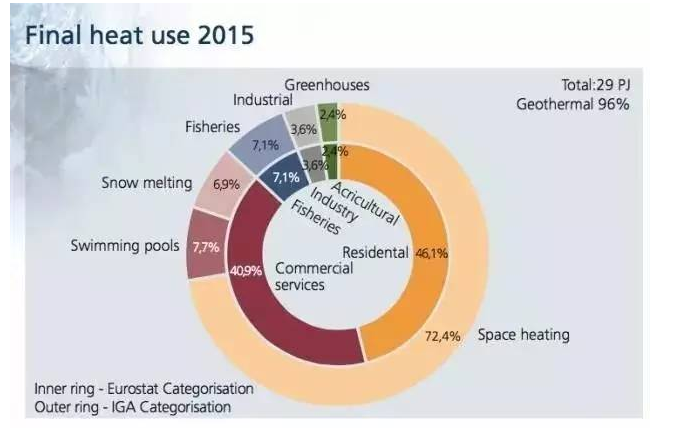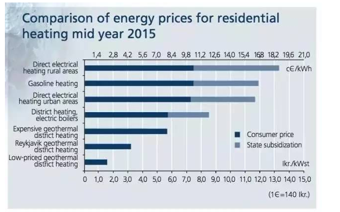 1940年以前,對燃煤供熱的過度依賴導致冰島的霧霾問題十分嚴峻。在短暫地轉向進口石油供熱后,冰島著手大規(guī)模地推進地熱供熱項目。截至2015年,據(jù)冰島能源局數(shù)據(jù),該國的地熱供熱比重已經(jīng)達到96%,全面覆蓋了居民、商業(yè)、工業(yè)、農(nóng)業(yè)和漁業(yè),環(huán)境問題得到改善的同時,供熱價格也顯著下降。