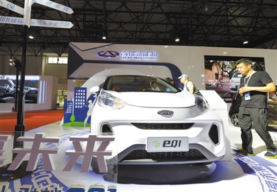 7月16日,在2017北京國際新能源汽車及充電設(shè)施展上,純電動和混合動力新能源車、電動汽車充電站建設(shè)等相關(guān)領(lǐng)域的最新技術(shù)、產(chǎn)品集中亮相。圖為奇瑞新能源推出的小型電動汽車。