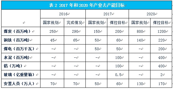 落實和完成2017年“三去一降一補”的煤控目標,以及實現2017年單位能耗和煤耗下降指標。2016年的供給側結構性改革中,鋼鐵煤炭行業的去產能都超額完成了年度計劃。2017年繼續抓好去產能的工作。煤控目標中,鋼鐵和煤炭去產能分別為6千萬噸和2億噸以上,見表2。除了鋼鐵和煤炭行業外,2017年要淘汰、停建、緩建5000萬千瓦煤電廠。除此之外,水泥、鋁、玻璃等行業去產能分別為1億噸、100萬噸和5千萬重量箱。去產能要抓好、抓實、見實效。做好60萬下崗工人的就業和安置工作,比政府計劃多安置10萬人。2017年上半年新增煤炭優質產能2億噸。在去產能過程中,新增產能的數量應該用落后產能的相應減少來替代,即2017年的國家去產能規劃應該是1.5+2=3.5億噸。相應的,煤控項目去產能目標應該是2+2=4億噸。