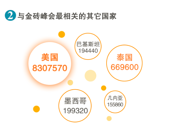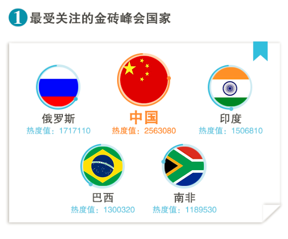 2017廈門金磚峰會召開期間,金磚五國最受關注,由熱度值從高到低排列依次為中國、俄羅斯、印度、巴西、南非。與之相應的,習近平也成為最受關注的金磚峰會國家領導人。