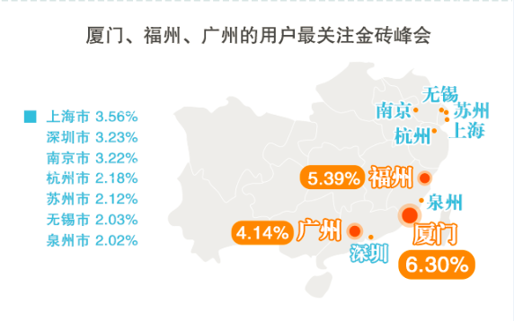 本次金磚峰會召開地點選定風景優美、開放包容的廈門。從報告中可看出,來自廈門的用戶最關注家鄉在國際舞臺上的閃亮登場,福州、廣州等鄰近東南沿海地區的用戶也格外關注。