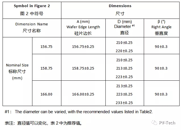 1)硅片的標(biāo)準(zhǔn)尺寸,現(xiàn)階段推薦為:156.75mm,158.75mm和166.00mm。其它尺寸為非標(biāo)尺寸,可以由供需雙方協(xié)商采用。