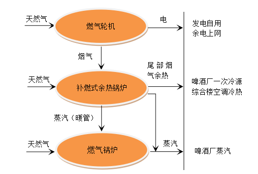 本項目主要為滿足華潤雪花啤酒四川公司的蒸汽負荷,余熱鍋爐尾部余熱為華潤啤酒廠供工藝冷水,作為華潤啤酒廠氨制冷的一次能源,同時滿足能源站空調冷暖負荷。項目投資8032萬元,年發電4110萬kWh,年供蒸汽15萬t,年供冷1.63萬GJ。