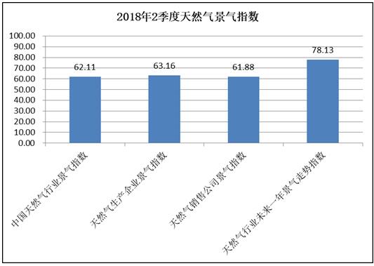 2018年2季度中國天然氣行業景氣指數為62.11,處于較景氣狀態,與2018年1季度相比有一定幅度的上升,景氣變動系數為1.035。在評價行業景氣指數的五大指標中,宏觀經濟指標基本保持不變,天然氣銷售公司經營狀態指標有一定幅度上升,天然氣行業專家判斷指標、天然氣生產企業經營狀態指標出現較大幅度上升,而天然氣進口狀態指標出現下降。總體來看,2018年2季度中國天然氣行業景氣指數仍呈現上升態勢。 [詳細]
