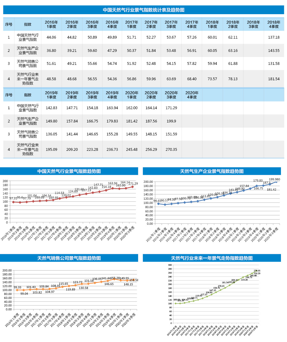 中國天然氣行業景氣指數統計結果顯示:2020年3季度中國天然氣行業景氣指數為171.29,處于景氣狀態;天然氣生產企業景氣指數為199.98,處于景氣狀態;天然氣銷售公司景氣指數為151.58,處于較景氣狀態;天然氣行業未來一年景氣走勢指數為270.35,處于很景氣狀態。 [詳細]