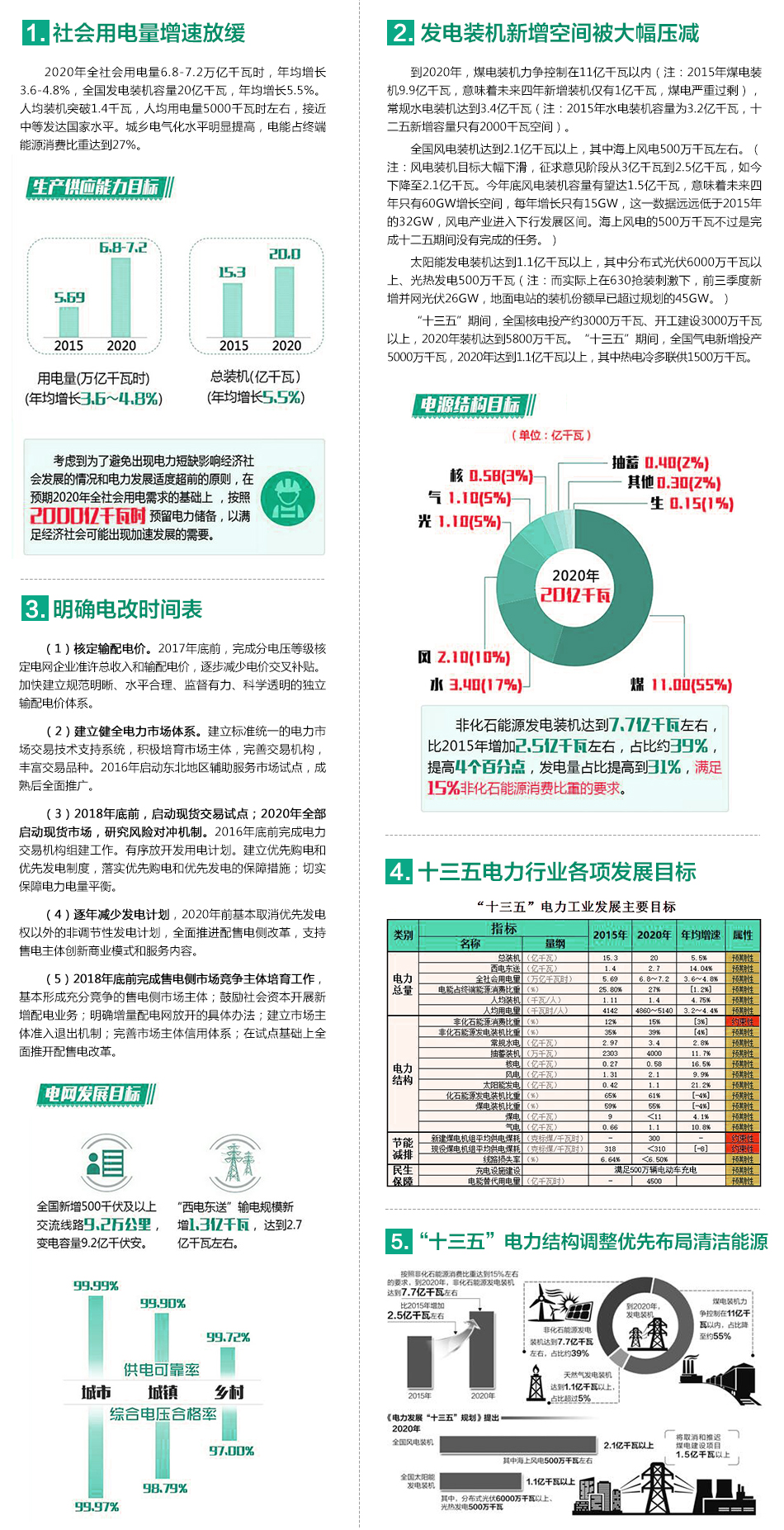 該《規劃》從供應能力、電源結構、電網發展、綜合調節能力、節能減排、民生用電保障、科技裝備發展、電力體制改革等8個方面繪制了電力發展的“十三五”藍圖。
