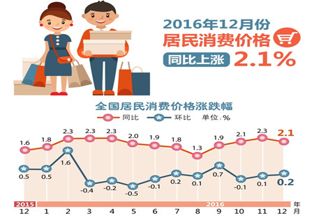 統(tǒng)計(jì)局:2016年CPI同比上漲2%2016年12月份,全國(guó)居民消費(fèi)價(jià)格總水平同比上漲2.1%。其中,城市上漲2.1%,農(nóng)村上漲1.9%;食品價(jià)格上漲2.4%,非食品價(jià)格上漲2.0%;消費(fèi)品價(jià)格上漲1.8%,服務(wù)價(jià)格上漲2.5%。2016年,全國(guó)居民消費(fèi)價(jià)... [詳細(xì)]