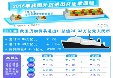 外貿(mào)數(shù)據(jù)逐季回穩(wěn) 結(jié)構(gòu)持續(xù)優(yōu)化1月13日,海關(guān)總署發(fā)布2016年中國(guó)進(jìn)出口情況。數(shù)據(jù)顯示,2016年,中國(guó)貨物進(jìn)出口總值24.33萬(wàn)億元人民幣,比2015年下降0.9%,外貿(mào)增速降幅較2015年收窄6.1個(gè)百分點(diǎn)。對(duì)此,專(zhuān)家指出,在復(fù)雜嚴(yán)峻的形勢(shì)下,... [詳細(xì)]
