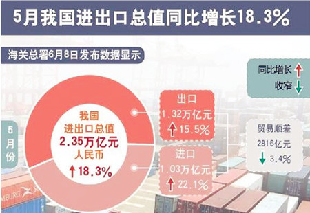5月進(jìn)出口雙雙延續(xù)正增長(zhǎng) 指數(shù)顯示出口形勢(shì)較樂觀海關(guān)總署8日發(fā)布進(jìn)出口數(shù)據(jù)顯示,今年前5個(gè)月,我國(guó)貨物貿(mào)易進(jìn)出口總值10.76萬億元人民幣,比去年同期(下同)增長(zhǎng)19.8%。其中,出口5.88萬億元,增長(zhǎng)14.8%;進(jìn)口4.88萬億元,增長(zhǎng)26.5%;貿(mào)易順差9940... [詳細(xì)]