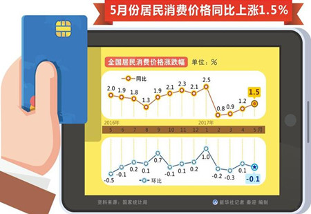 統(tǒng)計(jì)局:5月CPI同比上漲1.5%國(guó)家統(tǒng)計(jì)局今日公布數(shù)據(jù):2017年5月份,全國(guó)居民消費(fèi)價(jià)格總水平同比上漲1.5%。其中,城市上漲1.7%,農(nóng)村上漲1.1%;食品價(jià)格下降1.6%,非食品價(jià)格上漲2.3%;消費(fèi)品價(jià)格上漲0.7%,服務(wù)價(jià)格上漲2.9%。1-... [詳細(xì)]