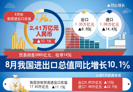 海關總署:8月我國進出口總值同比增長10.1%海關總署8日發布的數據顯示,8月份,我國進出口總值2.41萬億元,增長10.1%。其中,出口1.35萬億元,增長6.9%;進口1.06萬億元,增長14.4%;貿易順差2865億元,收窄14%。 [詳細]