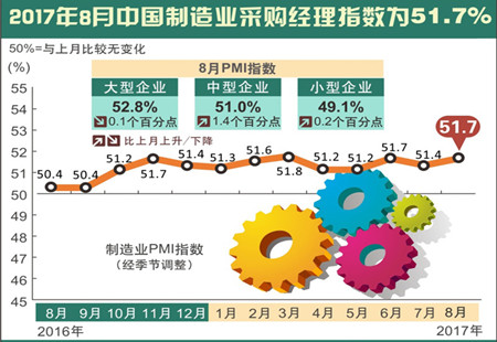8月份中國制造業采購經理指數為51.7%國家統計局、中國物流與采購聯合會31日聯合發布數據,8月份中國制造業采購經理指數(PMI)為51.7%,比上月上升0.3個百分點,制造業總體保持穩中向好的發展態勢。 [詳細]