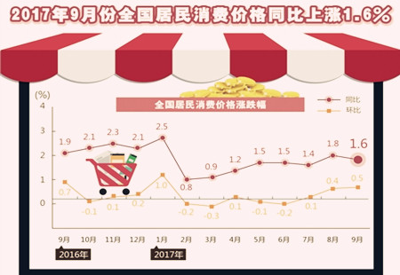 國家統計局:9月份CPI同比上漲1.6%2017年9月份,全國居民消費價格同比上漲1.6%。其中,城市上漲1.7%,農村上漲1.4%;食品價格下降1.4%,非食品價格上漲2.4%;消費品價格上漲0.7%,服務價格上漲3.3%。1-9月平均,全國居民消費價格總水... [詳細]