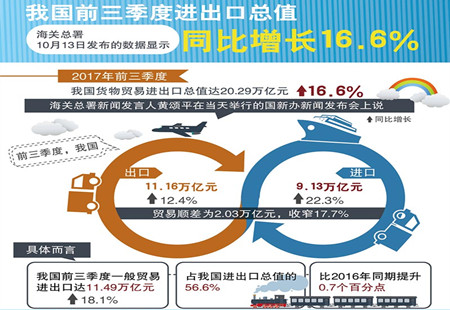 前三季度進口增22.3% 出口增12.4%10月13日上午,海關總署新聞發言人黃頌平在發布會介紹2017年前三季度進出口情況。據海關統計,前三季度,我國貨物貿易進出口總值20.29萬億元人民幣,比去年同期增長16.6%。其中,出口11.16萬億元,增長12.4%... [詳細]