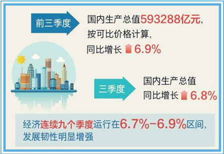 前三季度中國經濟同比增長6.9% 穩中向好國家統計局19日發布數據,初步核算,今年前三季度國內生產總值(GDP)同比增長6.9%,其中,第三季度GDP同比增長6.8%,經濟連續9個季度運行在6.7%至6.9%的區間,保持中高速增長。 [詳細]