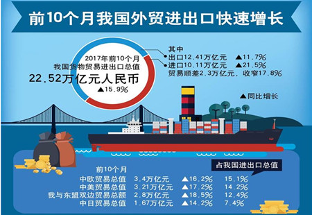 今年前10個(gè)月我國(guó)外貿(mào)同比增長(zhǎng)15.9%據(jù)海關(guān)統(tǒng)計(jì),今年前10個(gè)月,我國(guó)貨物貿(mào)易進(jìn)出口總值22.52萬(wàn)億元人民幣,比去年同期(下同)增長(zhǎng)15.9%。其中,出口12.41萬(wàn)億元,增長(zhǎng)11.7%;進(jìn)口10.11萬(wàn)億元,增長(zhǎng)21.5%;貿(mào)易順差2.3萬(wàn)億元,收窄17... [詳細(xì)]