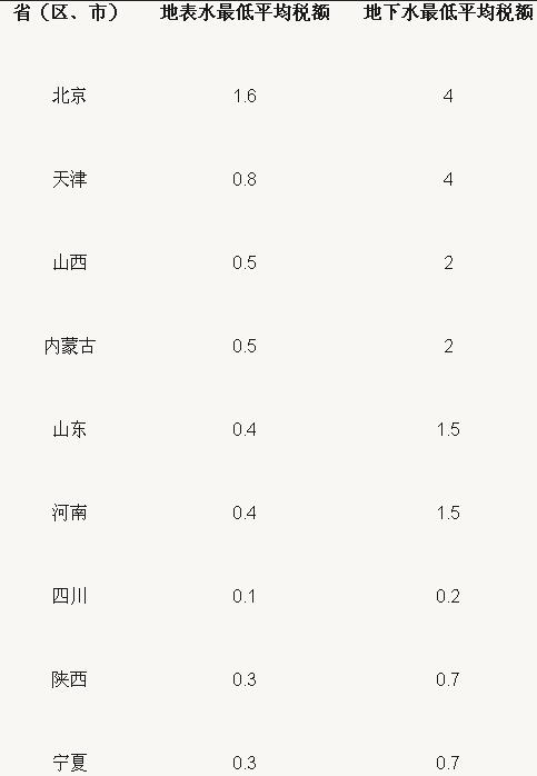 第九條 除中央直屬和跨省(區、市)水力發電取用水外,由試點省份省級人民政府統籌考慮本地區水資源狀況、經濟社會發展水平和水資源節約保護要求,在本辦法所附《試點省份水資源稅最低平均稅額表》規定的最低平均稅額基礎上,分類確定具體適用稅額。