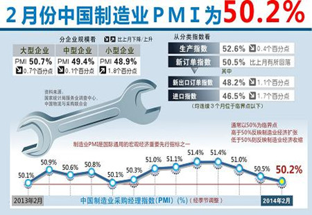 統(tǒng)計(jì)局解讀2月PMI:制造業(yè)繼續(xù)擴(kuò)張 企業(yè)信心增強(qiáng)2014年3月1日國家統(tǒng)計(jì)局服務(wù)業(yè)調(diào)查中心和中國物流與采購聯(lián)合會發(fā)布的中國制造業(yè)采購經(jīng)理指數(shù)顯示,2014年2月中國制造業(yè)PMI為50.2%,比上月回落0.3個百分點(diǎn),仍高于臨界點(diǎn),表明我國制造業(yè)繼續(xù)保持?jǐn)U張態(tài)勢,但增速... [詳細(xì)]